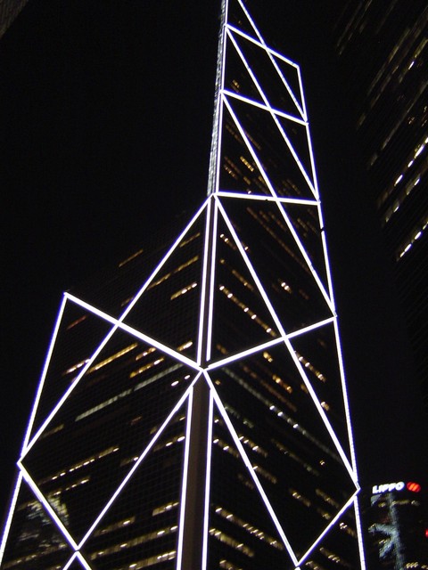 這棟是鼎鼎有名的『中銀大樓』,是中國頂級建築師-貝聿銘所設計,大樓外觀由多個高大三角形所組成,像似一把刀,有風水師認為這建築會破壞鄰近前港督府的風水,哈哈~香港人可是很迷信的。